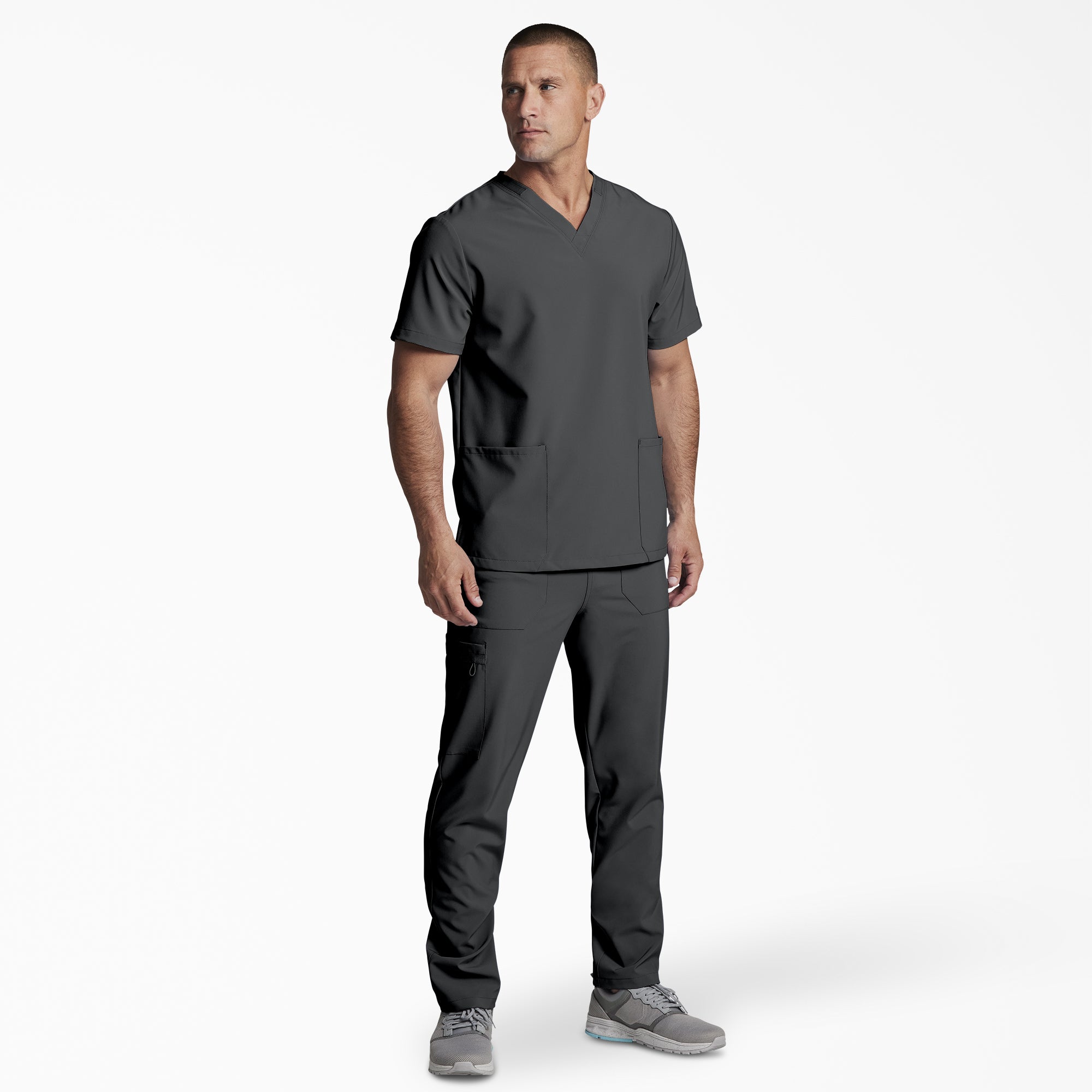 This Unisex fit v-neck top has twill tape detail at the neckline. two front patch pockets. a back yoke seam. and side vents.